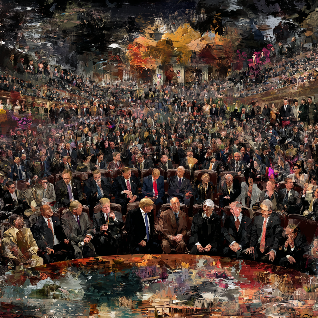 Prompt: Politically charged atmosphere, lawmakers deciding on various schemes, burn of conflicts and uprisings, sense of societal tension and political chess play, fears of tech bubble for AI industry, sports achievements celebrated, lurking wave of health issues, investigative journalism dynamism, legal battles’ twists and turns, escalating climate change and its impact, uncovered hidden tales from nature, literary history revived, mourning loss of iconic music producer.
