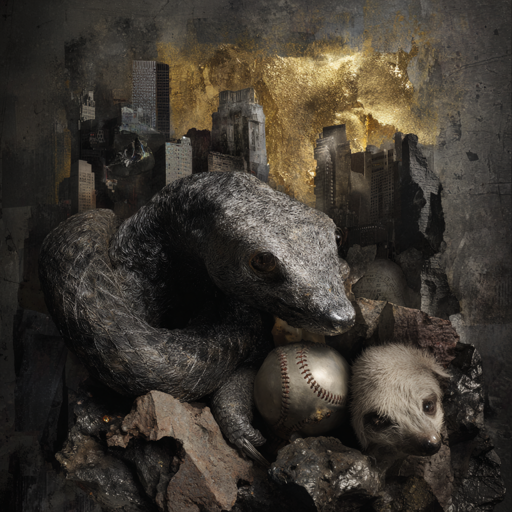 Prompt: A shadowy warehouse filled with sloths, an oversized AI chip melting into circuitry shaped like a dragon, a golden baseball soaring as city skylines wrap around it, silver jewelry glinting like moonlight
