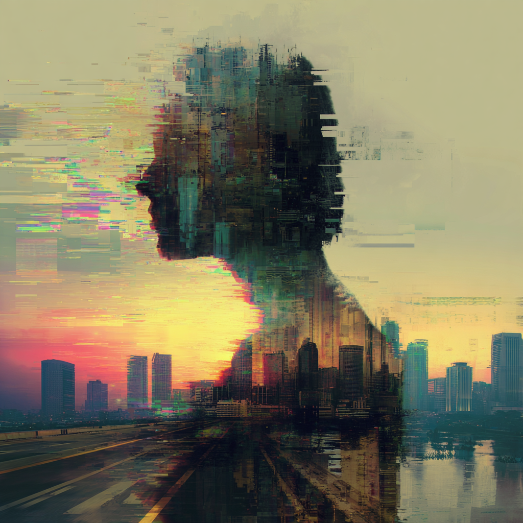 Prompt: Record-breaking marathon triumph, hidden Android data transfers, massive student debt frustration, and a chaotic scene at a prestigious hotel converge in a surreal cityscape at dawn, digital glitch art style