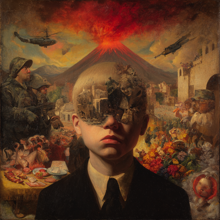 Prompt: Uncertain political landscape, allegations, and legal battles stirring tension, flurry of election campaigns, confrontations and negotiations over budget and trade tariffs, global health and pension concerns, surveillance technology controversies, acts of violence and tragedy, unresolved mysteries, technological advancements and fascination with extinct species
