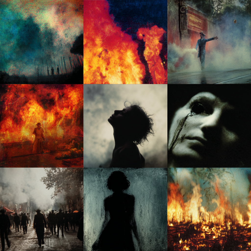 Prompt: Flurry of international incidents and significant events, ranging from diplomatic relations and political turmoil to expressions of extreme sports enthusiasm and cultural milestones, intense feelings of suspense, unexpected danger, political uncertainty, invigorating sports excitement, passionate music revival, dramatic theatrical loss, increasing natural dangers, peaceful historical reflections, childhood joyous wonder.