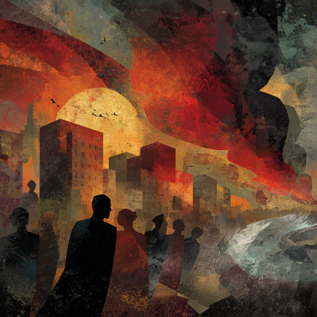 Prompt: Protests and political chaos, strained health system, elections under tension, struggles in sports, threats and resilience in the face of natural disasters, a tone of apprehension, commitment and loss, newly emerging opportunities and the harsh reality of death.