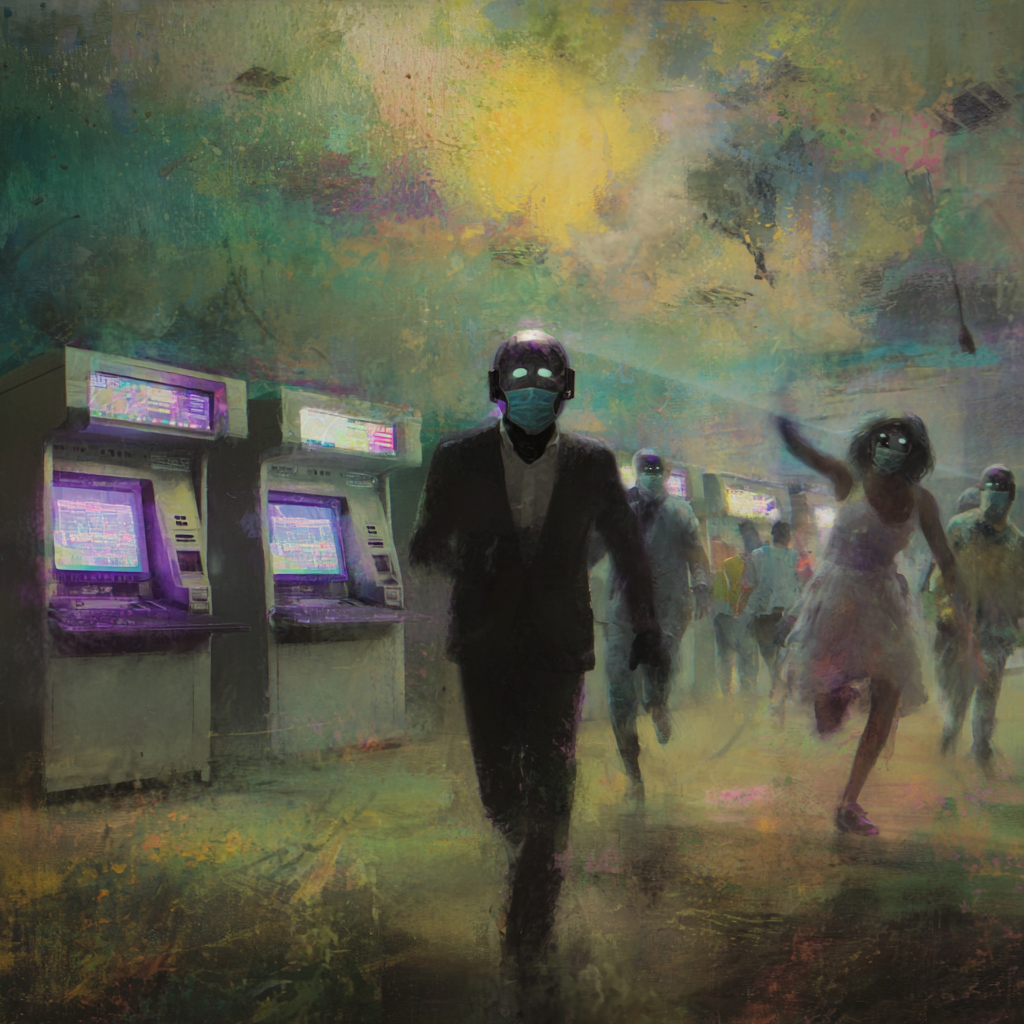 Prompt: A futuristic airport scene with maskless robotic agents among rushing travelers, an AI tennis match displayed on screens, oversized ATM machines emitting digital glitches, atmosphere tense with an undertone of surveillance