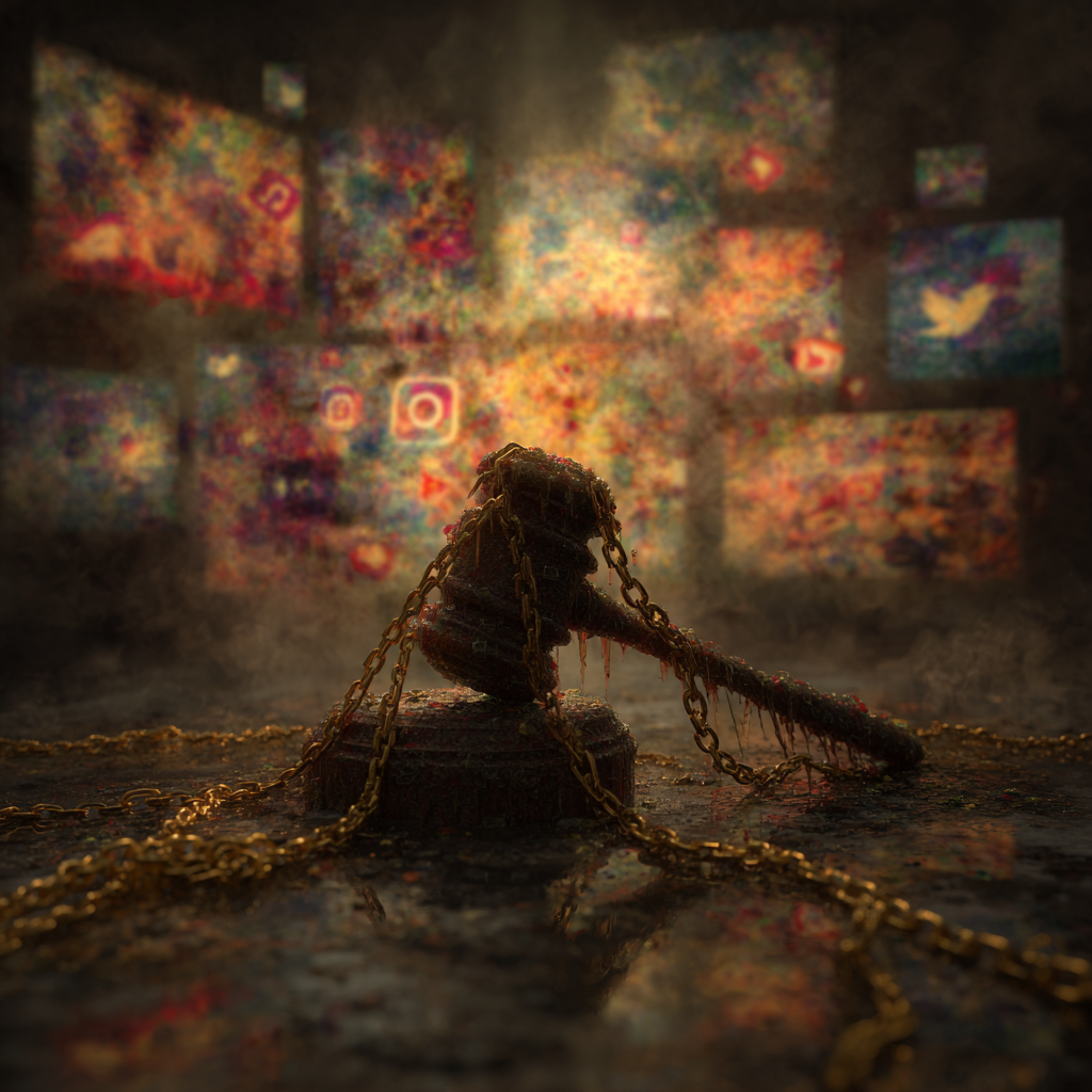 Prompt: A gavel shattered in front of screens streaming vibrant social media icons swirling into abstract childlike shapes as golden chains symbolize addiction all set against a shadowy digital metropolis