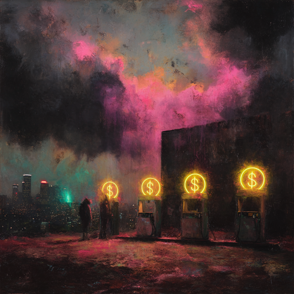 Prompt: A surreal cityscape at night featuring gas pumps with four dollar signs glowing, a chaotic airport TSA line where a passenger offers drinks, neon graffiti messages on a tall building, storm clouds brewing above