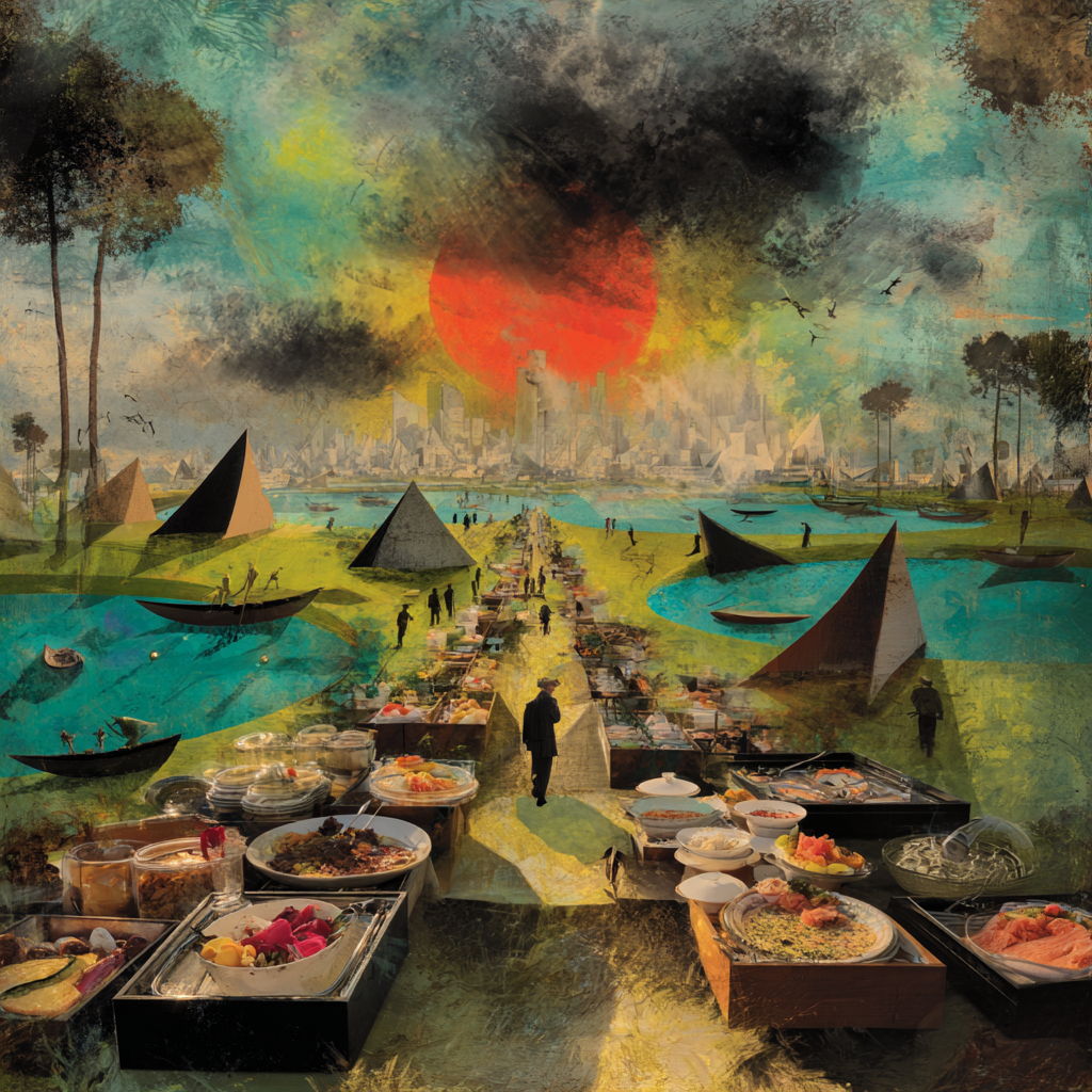 Prompt: A surreal buffet table stretches into a vast golf course scattered with empty grandstands and cracked grass patches, boats float nearby carrying travelers toward unreachable landmarks, phones locked in glass jars