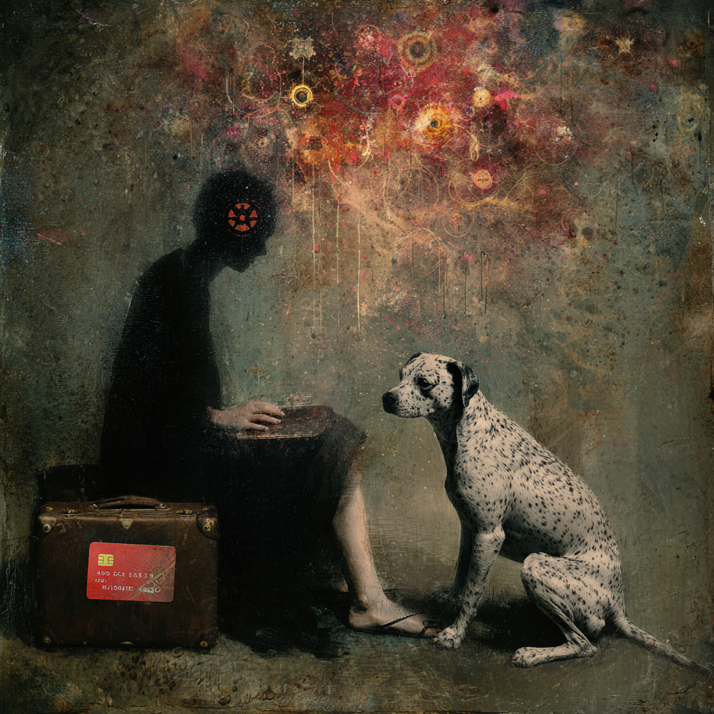 Prompt: A cancer survivor and her dog connected by the same diagnosis a shadowy figure with symbols of nuclear research a credit card splitting into data streams rising from a cracked vault